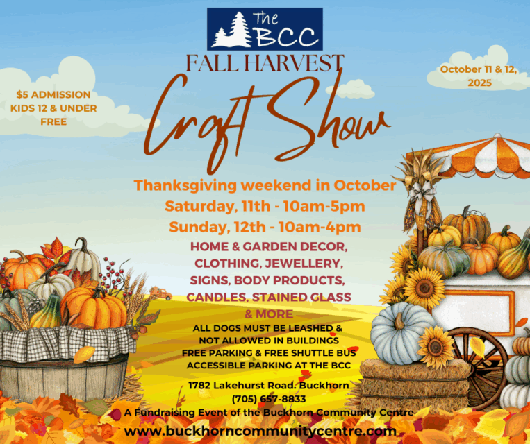 The Buckhorn Community Centre hosts the Harvest Craft show Thanksgiving Weekend, featuring artisans and crafters from across Ontario. The show will run Saturday, October 11 from 10am to 5pm; Sunday, October 12 from 10am to 4pm. This juried show features a wide variety of quality hand-crafted items including home décor, clothing, jewellery, scented items, and much more. Admission is $5.