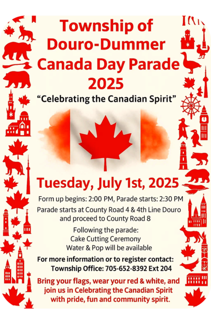 Join us Tuesday, July 1st, 2025 at 2:30 p.m. for the annual Canada Day Parade – rain or shine! The parade starts at County Rd 4 & Douro Fourth Line and ends at County Rd 8.