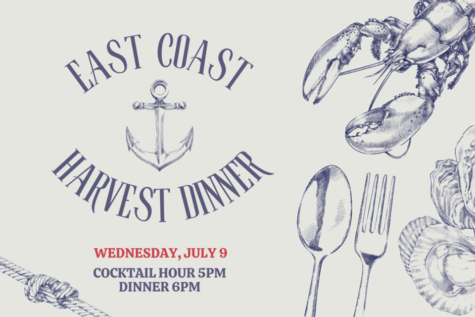 Join us on the patio on Wednesday, July 9th for a special East Coast-inspired themed Harvest Dinner — Kitchen Party style! This was our most popular Harvest Dinner last year and we’re so excited to do it again! We’ll kick the night off with a cocktail hour from 5:00 to 6:00 pm, featuring passed canapés before settling in for a 3-course plated meal with a wine tasting for each dish. Guests are free to arrive anytime during cocktail hour.