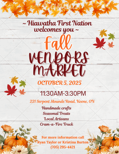 Hiawatha First Nation welcomes you for a Fall Vendors Market! Come shop handmade crafts, enjoy delicious seasonal treats, and support local artisans.