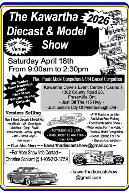 The Kawartha Diecast Show and Model Show is back at Kawartha Downs on April 18th from 9am to 2:30pm