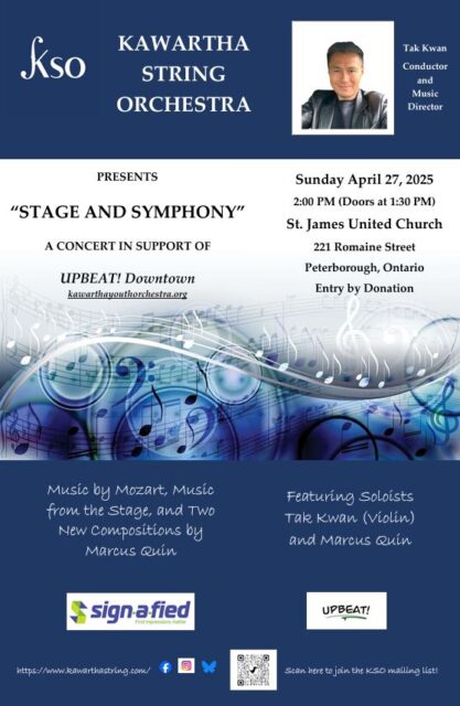 The Kawartha String Orchestra (KSO) is pleased to present their annual spring concert on Sunday April 27 starting at 2pm at St. James United Church (221 Romaine Street, Peterborough, ON).