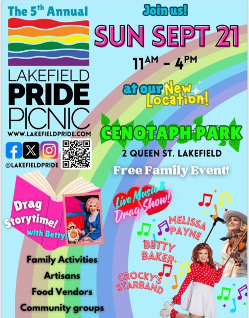 Join us in celebrating the Fifth Annual Lakefield Pride Picnic, taking place at Cenotaph Park on Sunday, September 21st in downtown Lakefield!