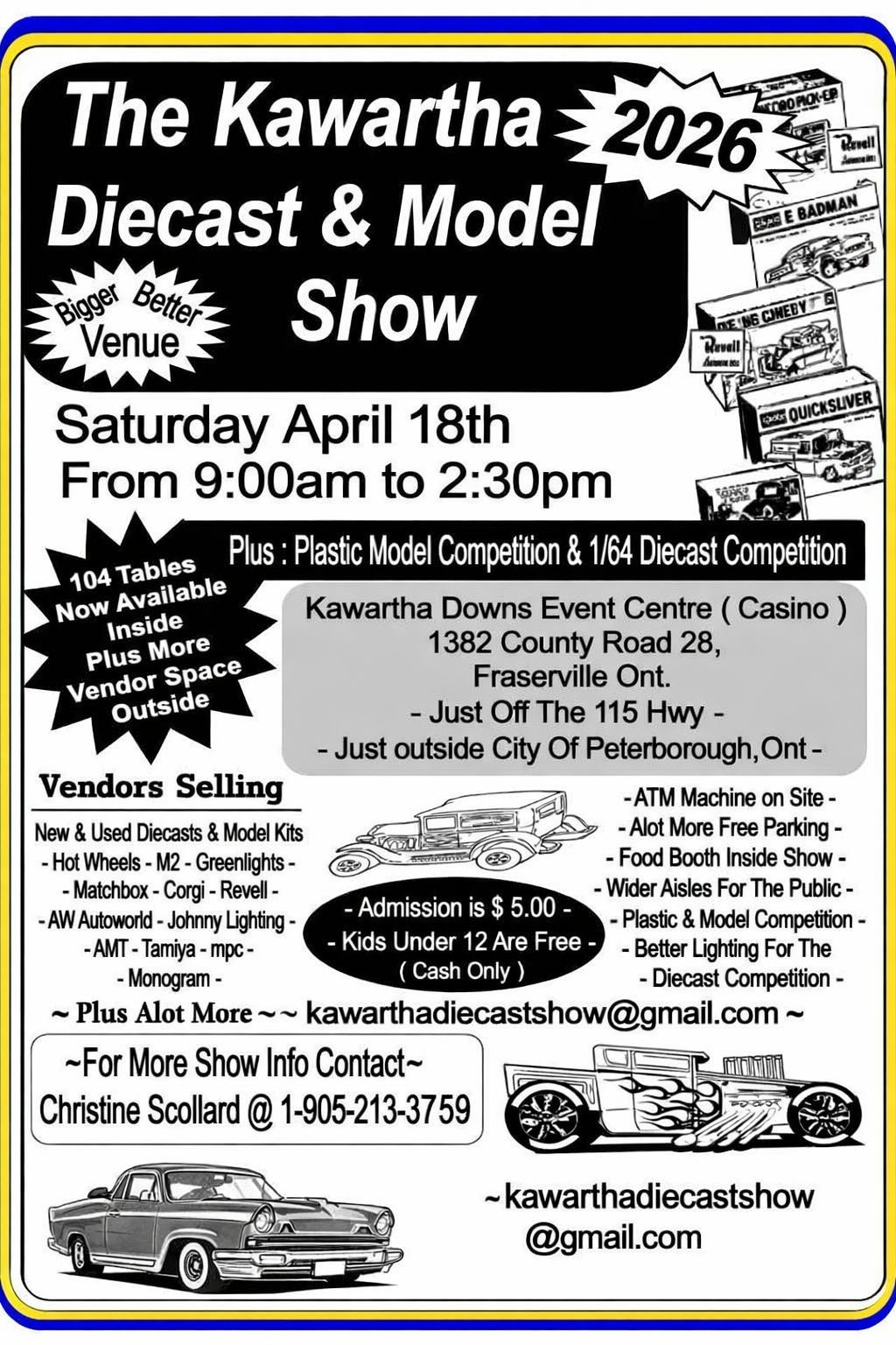 The Kawartha Diecast Show and Model Show is back at Kawartha Downs on April 18th from 9am to 2:30pm Find the latest hotwheels, all the vintage car toys you had…