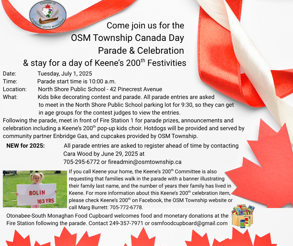 🎉 Celebrate Canada Day & Keene's 200th! 🎉Join us for the OSM Township Canada Day Parade and stay for a special Keene’s 200th Celebration event! 📅 Date: Tuesday, July 1,…