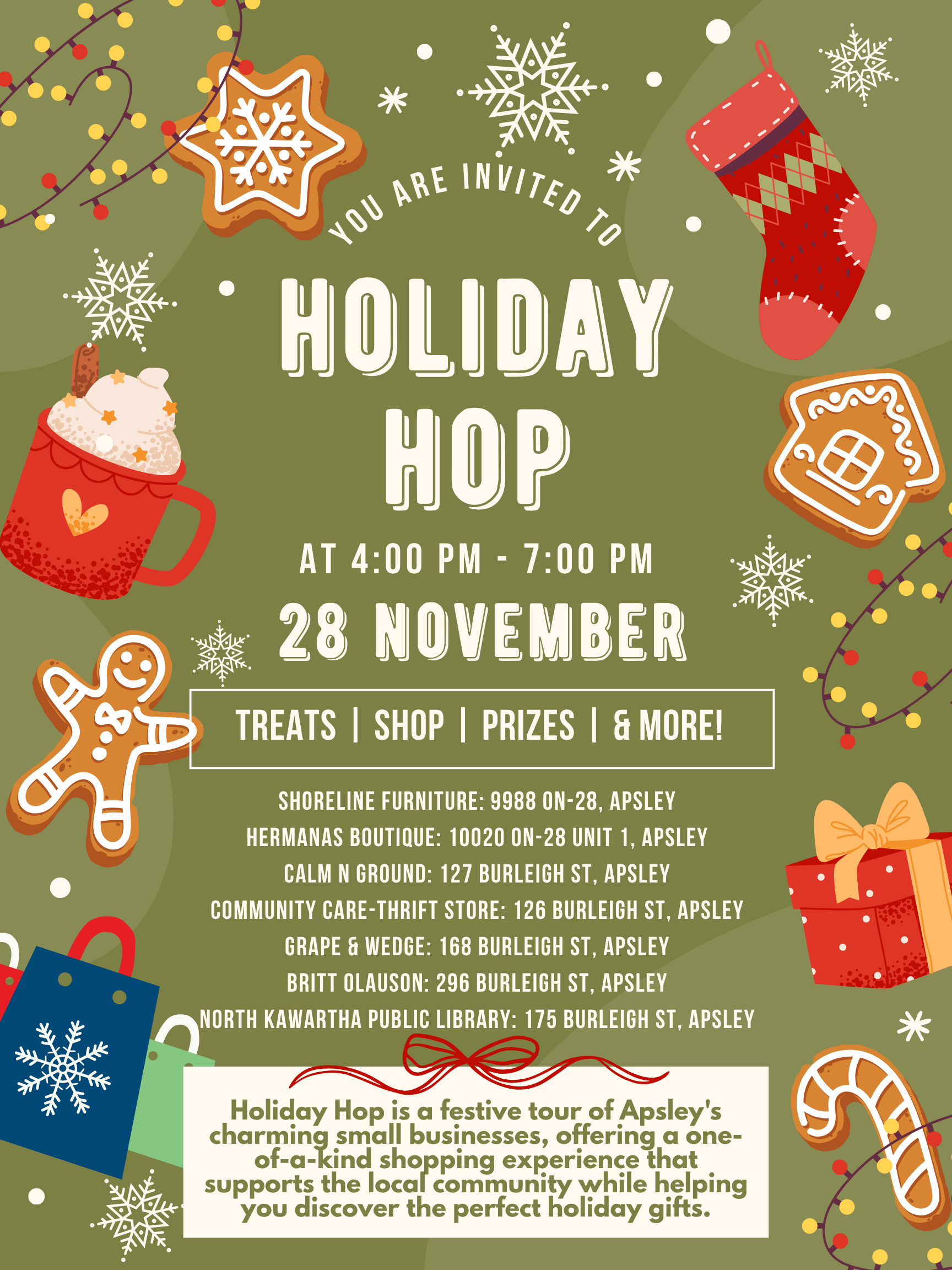 Holiday Hop is a festive tour of Apsley's charming small businesses, offering a one-of-a-kind shopping experience that supports the local community while helping you discover the perfect holiday gifts. Treats…
