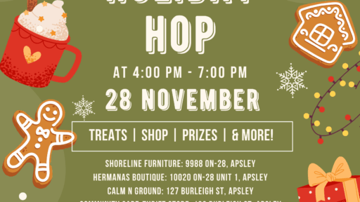 Apsley Burleigh Street, Apsley, OntarioHoliday Hop is a festive tour of Apsley's charming small businesses, offering a one-of-a-kind shopping experience that supports the local community while helping you discover the perfect holiday gifts. Treats…