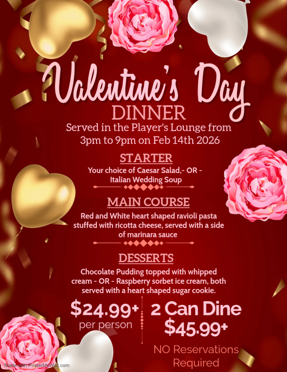 Join us for 3 course Valentine’s Day Dinner in a unique venue! Single $24.99+ tax OR Two can Dine for $45.99+tax MUST be 19+ to enter NO Reservations Needed